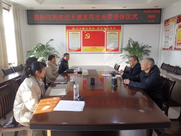 11月30日,舒城县科技局举行干部光荣退休仪式,欢送王德友同志光荣退休,局党组书记、局长卢月舒出席仪式并讲话,局党组成员参加仪式。
